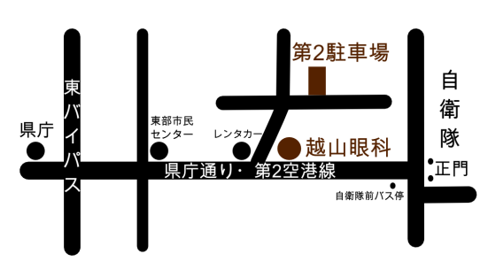 車でお越しの場合:健軍自衛隊正門から県庁へ100m。